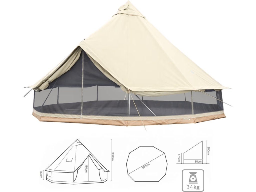 Stan svou konstrukcí umožňuje jak klasické používání se stěnami z neprůhledného a vodě odolného heavy duty materiálu 340g/m2, tak i zvednutí stěn a využívání síťovaného materiálu po celém obvodu stanu při horkých dnech. Novinkou jsou otvory - průduchy pro vyvedení případných komínů při vytápění stanu z ohně odolných materiálů. Konstrukce stanu je tvořena ocelovými tyčemi, půdorys je fixován sadou kolíků.