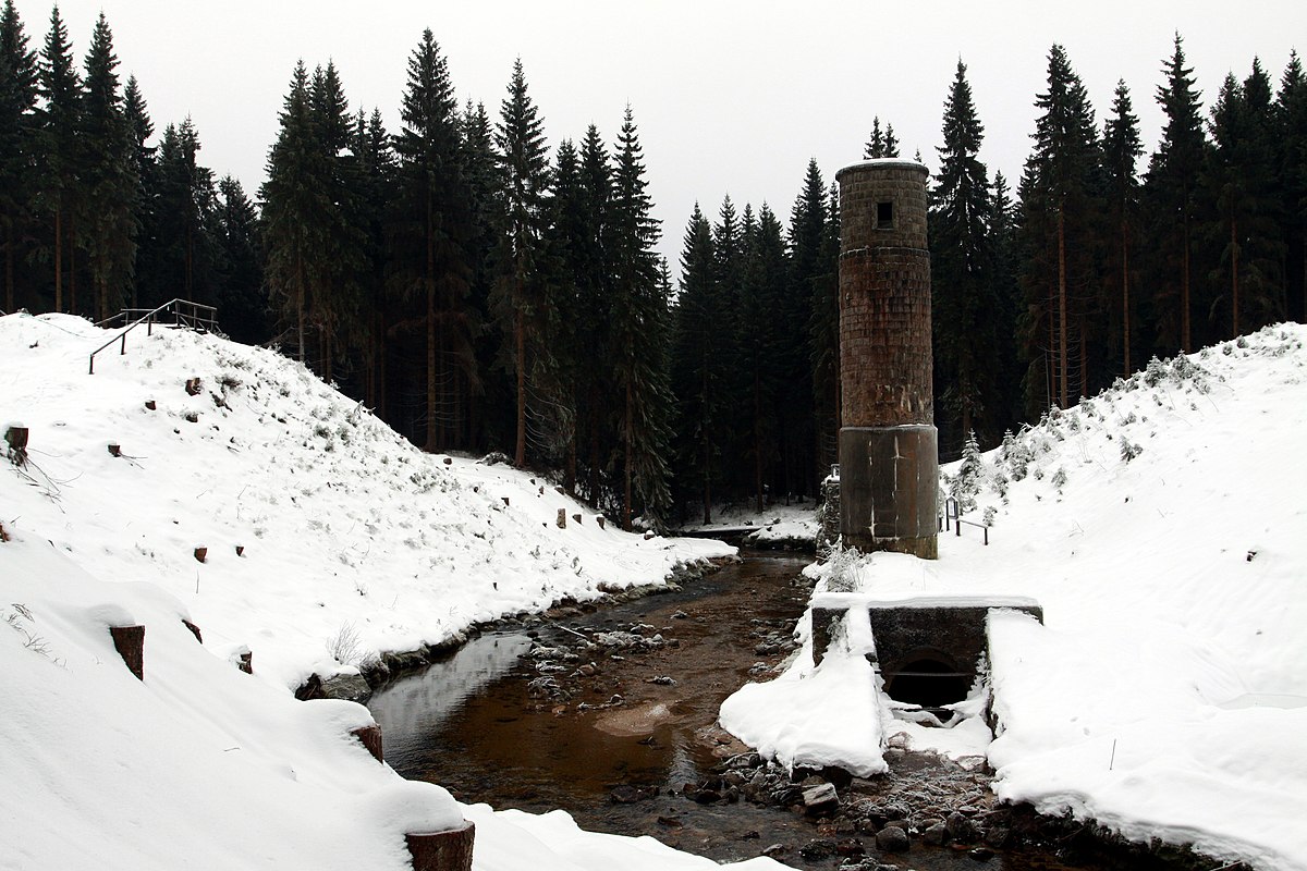 Šoupátková věž, zbytky hráze a ledové závoje na Bílém potoce vytvářejí silné kontrasty. Skvělé místo na dlouhé expozice i detailní záběry struktury ledu.