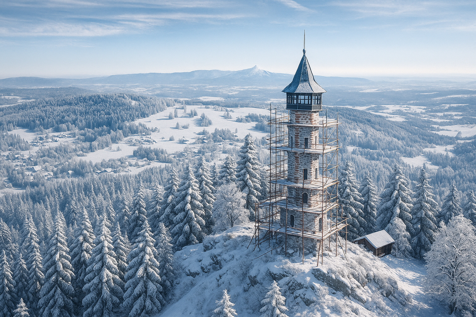 Nejfotogeničtější věž Jizerek. Silueta novogotické rozhledny v zasněženém lese funguje zespodu i z ochozu. V mrazivých dnech sem často "padá" inverze - oblačné moře pod vámi je bonus.